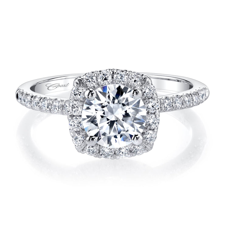 A refined cushion shaped halo of diamonds surrounds a 1 ct center stone. Diamonds cascade down the shank, adding extra sparkle. Shown with matching band. Band sold separately.