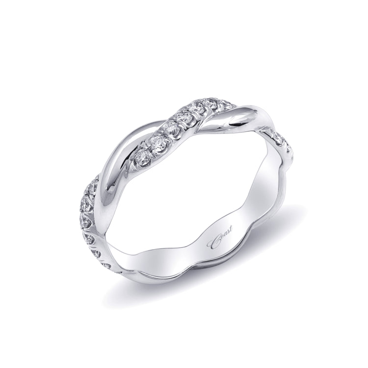 A delicate wedding band featuring sparkling fishtail set diamonds across the top half of the ring.
