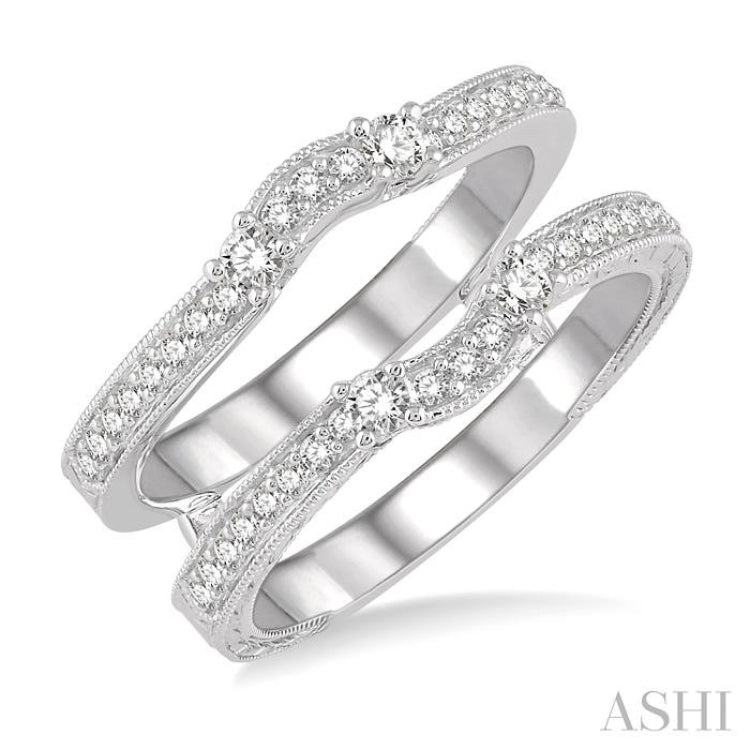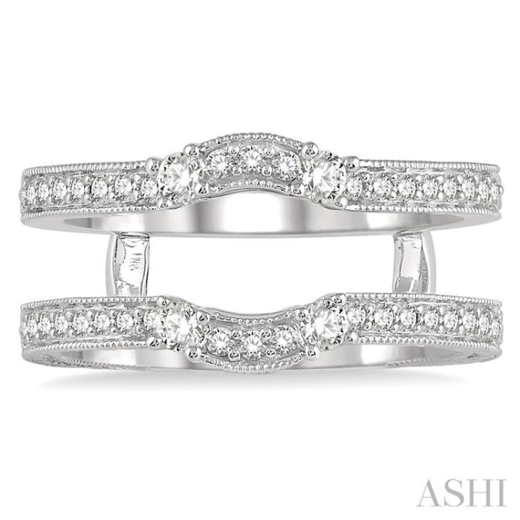 This well-designed lattice diamond insert ring can make a filling addition to a less wide ring. It is also offered a curved center so that it can easily accommodate a mount ring within it. Each ring is embellished with five 1/50 Ct prong set round cut diamonds, lining the arched center. The shank is adorned by 8 pave set round cut diamonds, on either side of shank, totaling 32 round diamonds altogether. A detailed pattern on the sides, along with a milgrain finish, add to the stylish look of the insert ring, which is crafted in 14 karat white gold. Total diamond weight is 1/2 Ctw.