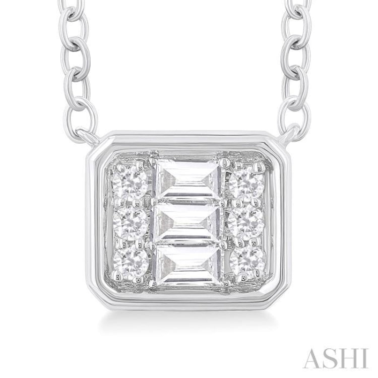 Simple but elegant, this Petite fusion diamond fashion pendant elevates both formal and semi-formal ensembles, in its own stylish way. It features an east-west bezel set emerald shape mount that is eye-catchingly embellished with a fusion of baguette and round cut diamonds. 3 prong set baguette cut diamonds are horizontally laid along the center of the emerald, flanked by 3 each prong set round cut diamonds, adding a touch of brilliance and symmetry to the pendant's design. A CAT23 chain complements the Petite fusion diamond fashion pendant, both of which are crafted in a rhodium finish 10 karat white gold. The total diamond weight is 1/6 Ctw.