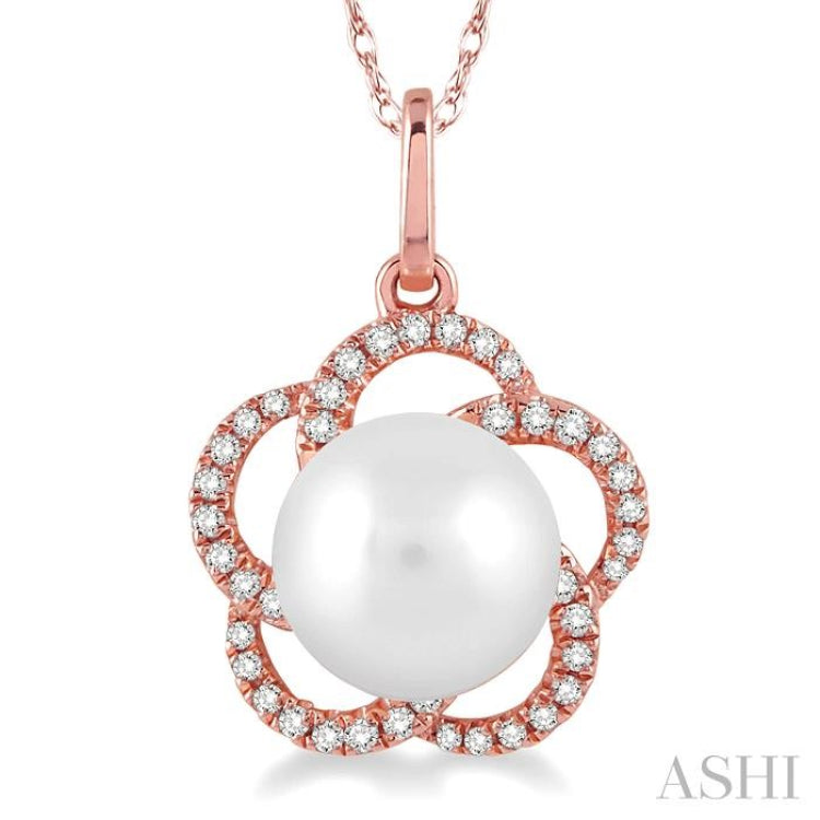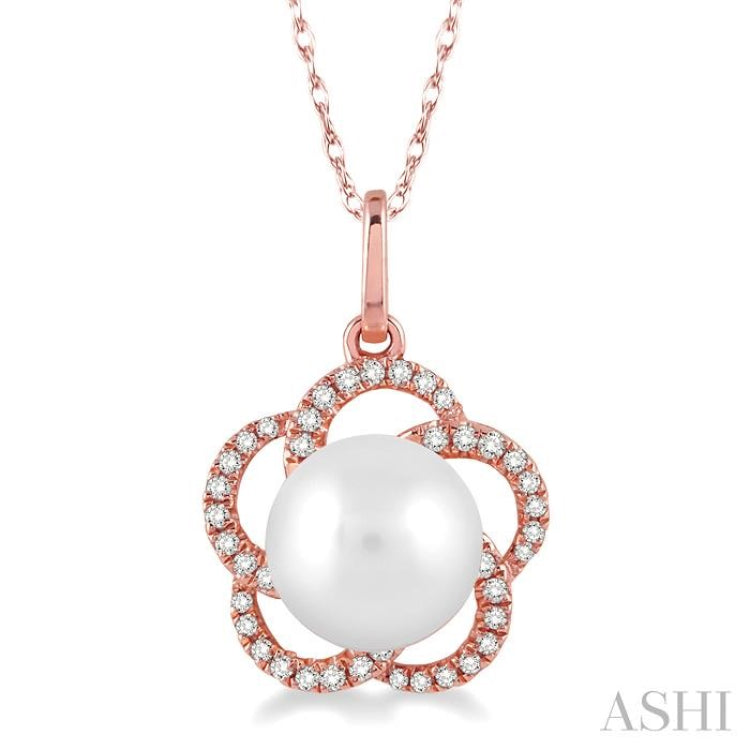 7 MM Cultured Pearl and 1/8 Ctw Single Cut Diamond Pendant in 14K Rose Gold with Chain