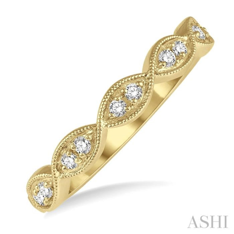 A delicate and refined marquise mount diamond ring, this captures your attention instantly. The fashion band comprises of 5 marquise mounts that join each other at the tips, to form a neat row. A marquise finish to the borders of the mounts, offers a twisted like look, while adding a highlighting touch to the mounts. Also enhancing the mounts are 1/50 Ctw pave set round cut diamonds, 2 each on every mount, making a total of 10 diamonds in all. The ring is crafted in 14 karat yellow gold. The total diamond weight is 1/8 Ctw.