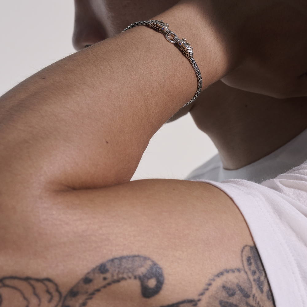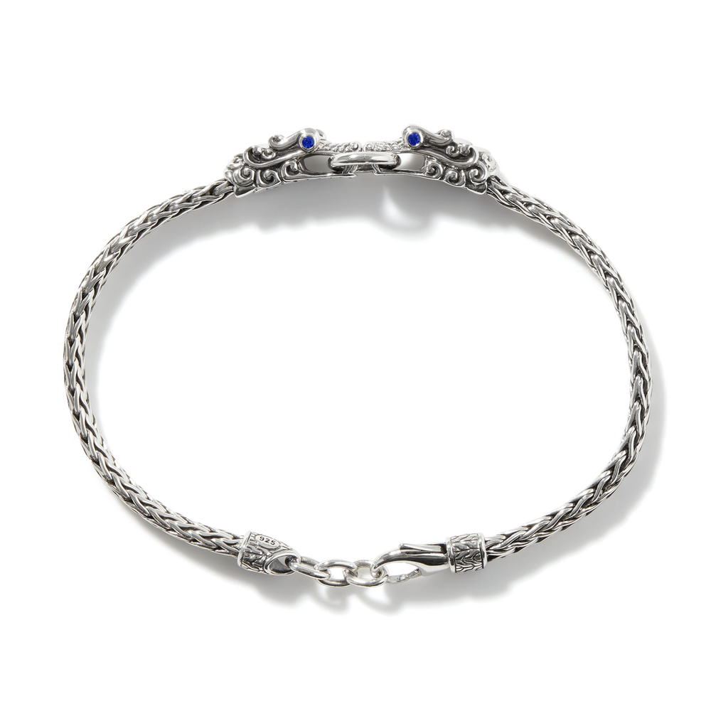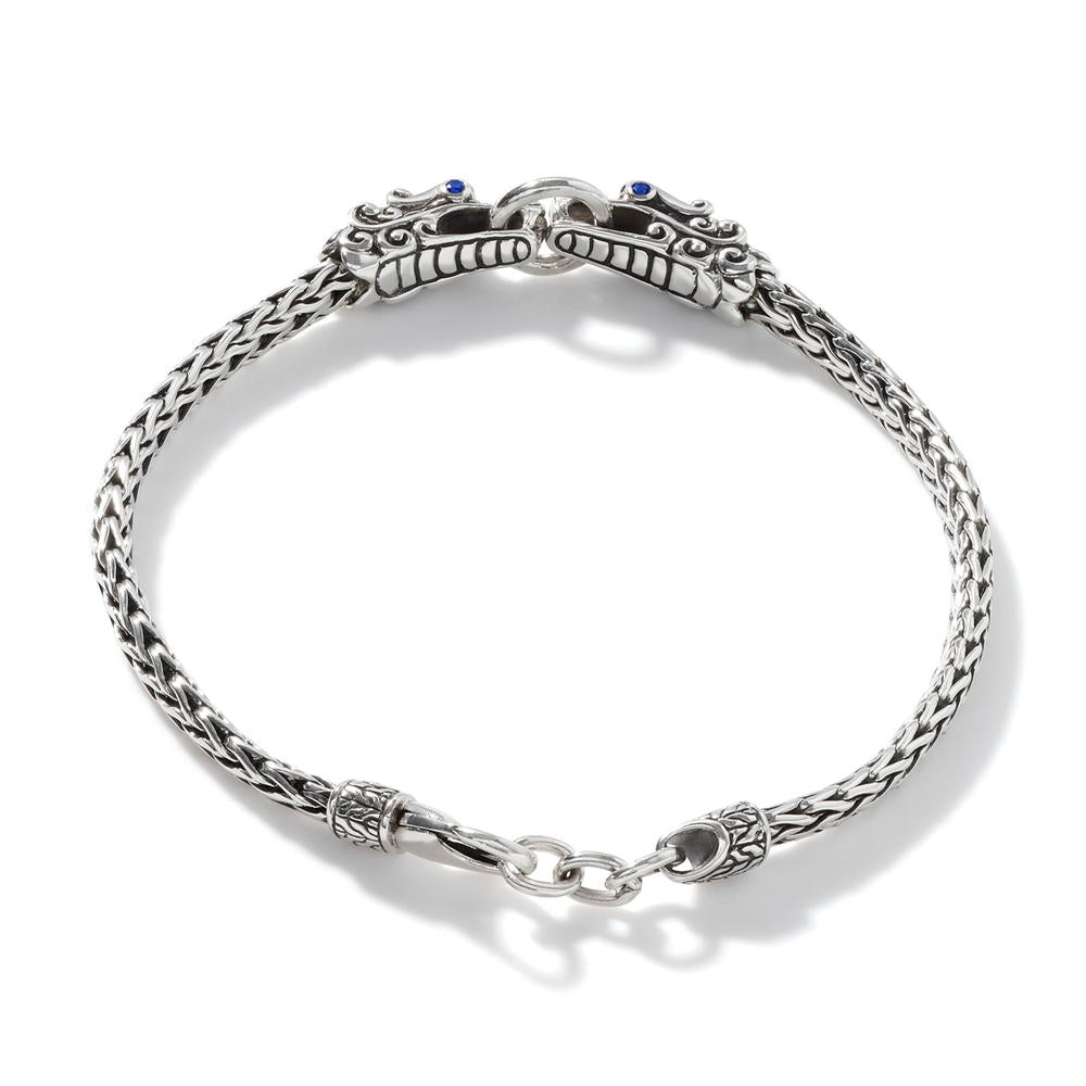 Naga Heritage Silver Double Dragon Head Slim Chain Bracelet 3.5mm with Lobster Clasp with Blue Sapphire Eyes, Size UM